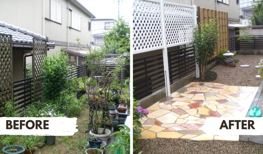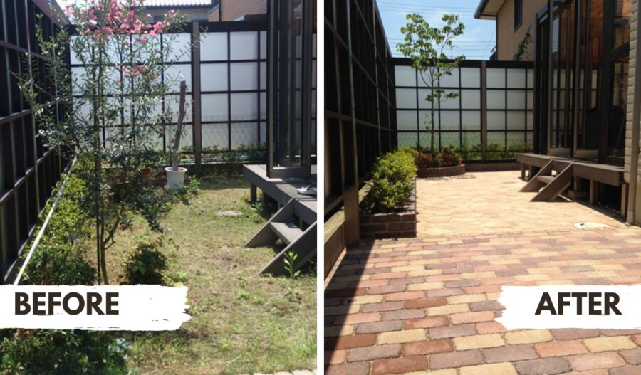 砂利や土の庭から「タイルテラスとコンクリート」で雑草対策に成功した事例(奈良県奈良市O様邸)