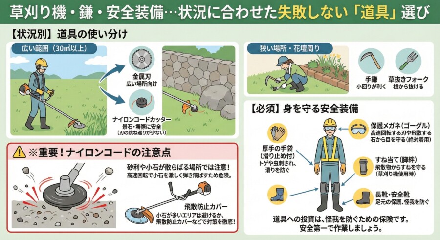 道草刈り機・鎌・安全装備…状況に合わせた失敗しない「道具」選び 道具選びは作業効率を左右します。広い範囲(30㎡以上)には、エンジン式や充電式の「刈払機(草刈り機)」が必須です。景石が多い場所や塀の近くでは、金属刃ではなく「ナイロンコードカッター」を使うと、刃の跳ね返りが少なく安全です。