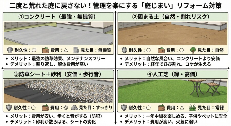 - 防草シートやコンクリートなどで「二度と荒れさせない」庭にするリフォーム手法