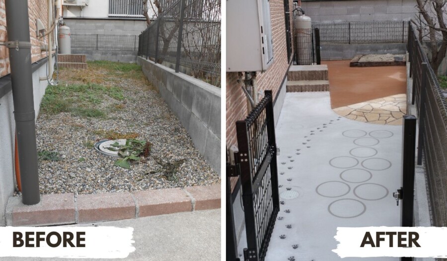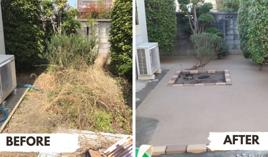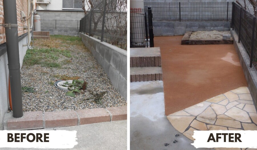 施工中に予期せぬコンクリートの基礎が見つかるハプニングもありましたが、慎重に対処し、雑草対策という課題を解決するだけでなく、家族の笑顔が溢れるオンリーワンの空間が完成しました。