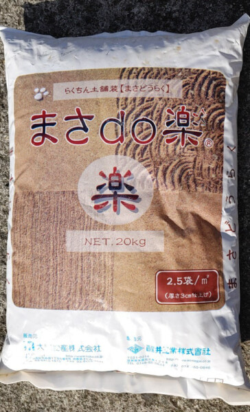 ⑤まさdo楽 (醒井工業)固まる土(セメント系)自然土、固化剤、混和剤プロ仕様の高機能・高強度タイプ。照り返し抑制、防塵効果あり。施工に手間と技術を要する。DIYでの入手は困難