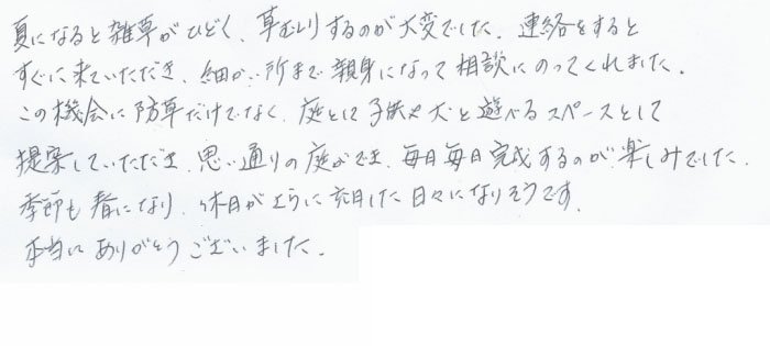 「毎週のようにやっていた草むしりが全くなくなり、本当に感動しています。何より、子供が庭で安心して走り回れるようになったのが嬉しいですね。」