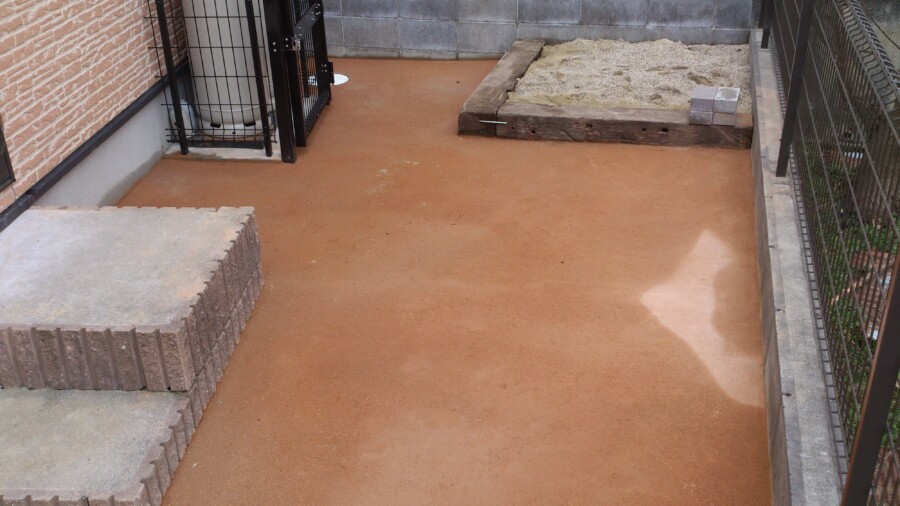 具体的には、お子様と愛犬がメインで遊ぶことになる主庭の約20㎡に、高強度タイプの固まる土を施工。