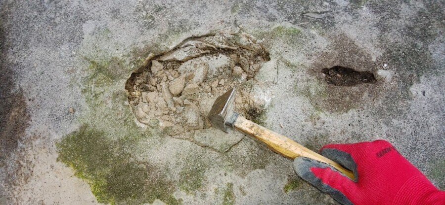固まった土はコンクリートに近い硬さになるため、ハンマーや電動ピックなどで物理的に砕いて取り除くしかありません。小面積であればDIYでも不可能ではありませんが、体力的には非常に大変です。