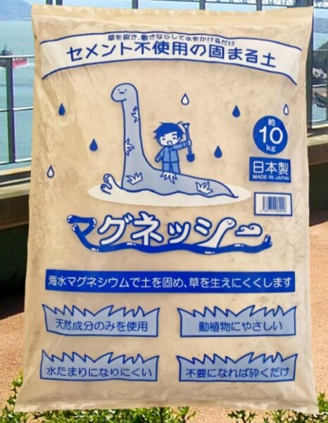 従来の固まる土がセメントを主成分としているのに対し、この製品は海水由来の天然マグネシウムを固化材に使っているのが最大の特徴。