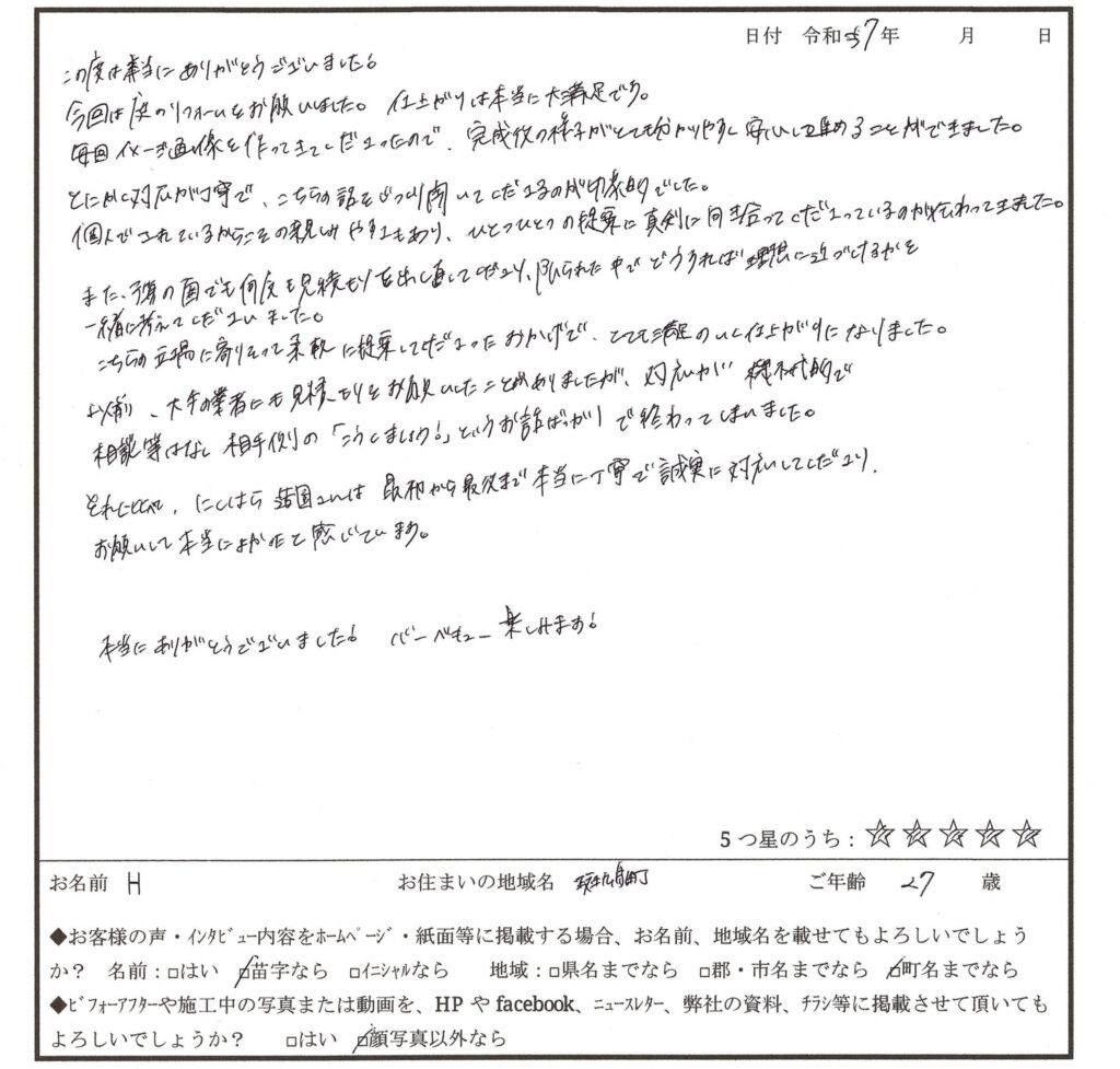 H様のお声 完成後の様子がとても分かりやすく安心して進めることができました。