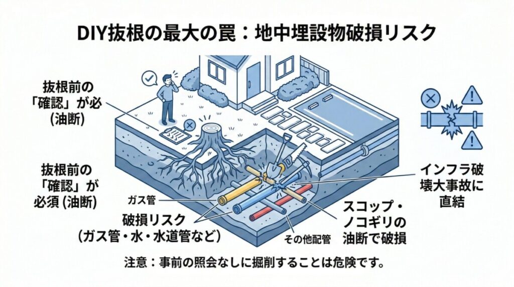 | 事故を誘発する道具 | スコップ、ノコギリ、ツルハシ | 根を切る瞬間・振り下ろした瞬間に管を叩き割る |