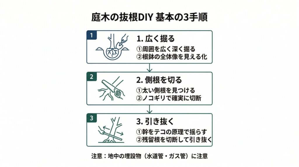 お庭の環境や体力的な制約を考慮しつつ、DIYでも確実に木を抜くための「掘る・切る・揺らす」というプロも実践する3つの基本手順と、失敗しないためのコツを順番に解説します。