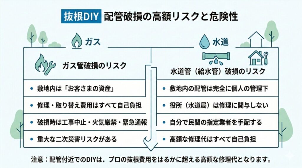 節約のためにDIYを選んだはずが、プロの抜根費用をはるかに超える高額な修理代を請求されるという悲惨な結末を避けるためにも、配管付近での作業は絶対に行わないでください。