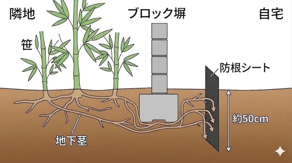 根本的な解決には、境界線沿いに防根シートなどの遮蔽物を深さ50cm程度まで埋め込み、物理的に侵入を防ぐ対策が有効です。