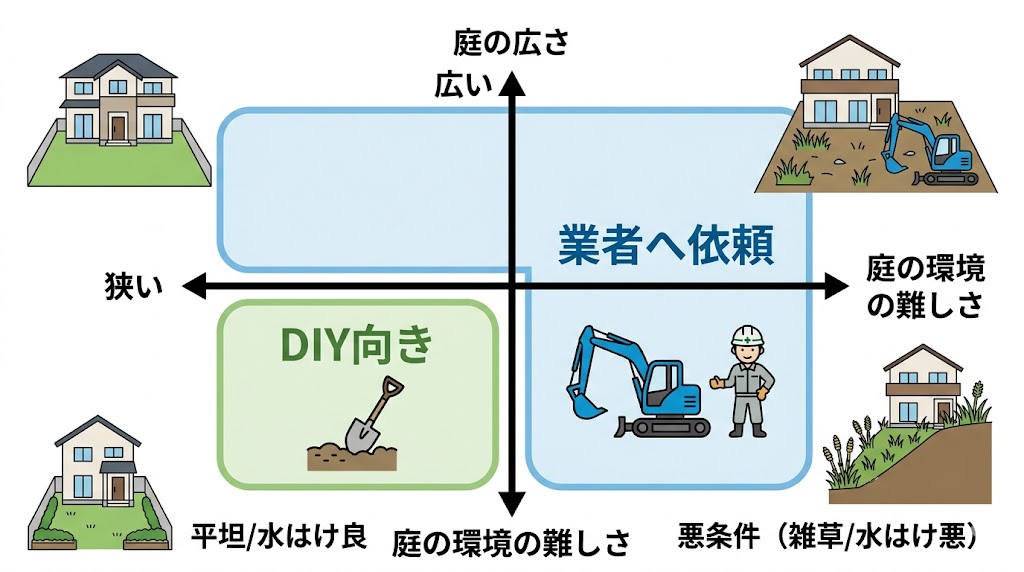 DIYをおすすめするのは、「施工面積が10平米(約3坪)未満と狭く、地面が平らで、水はけに問題がない庭」です。この条件なら体力的な負担も少なく、大きな失敗のリスクも低く抑えられます。