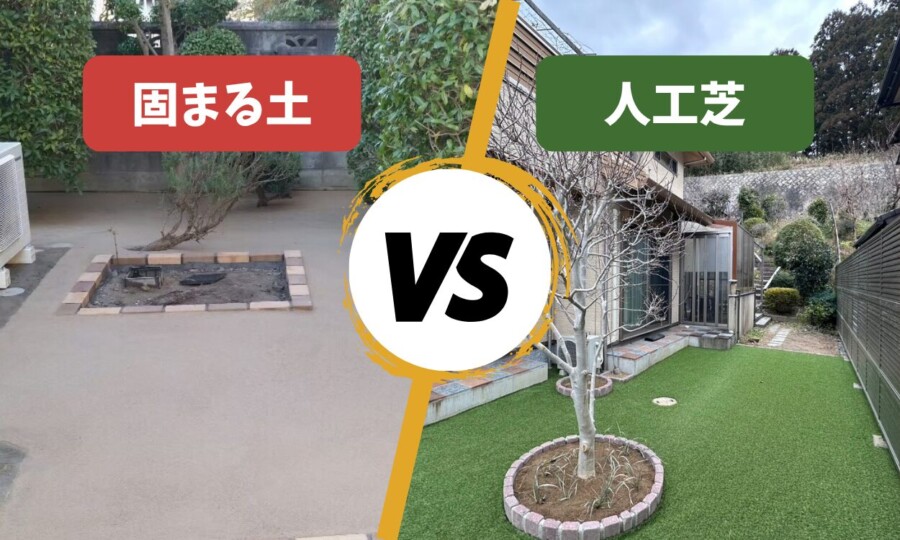 景観は好みによります。**「緑の絨毯」が欲しいなら人工芝、「自然な土の風合い」**が良いなら固まる土です。