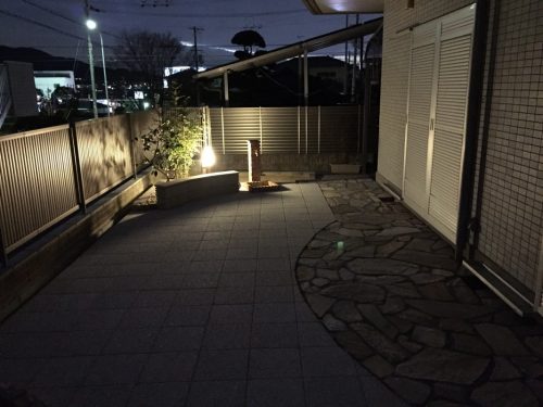 照明が一つあるだけで防犯面もよくなります。目線も入らず、虫も減ったので、夜風にあたりながらご夫婦で一杯できるお庭になりました。