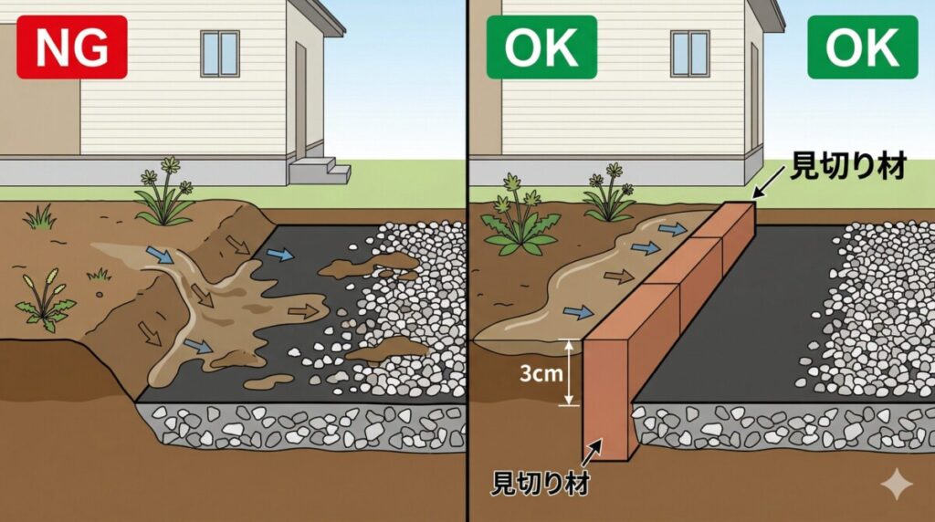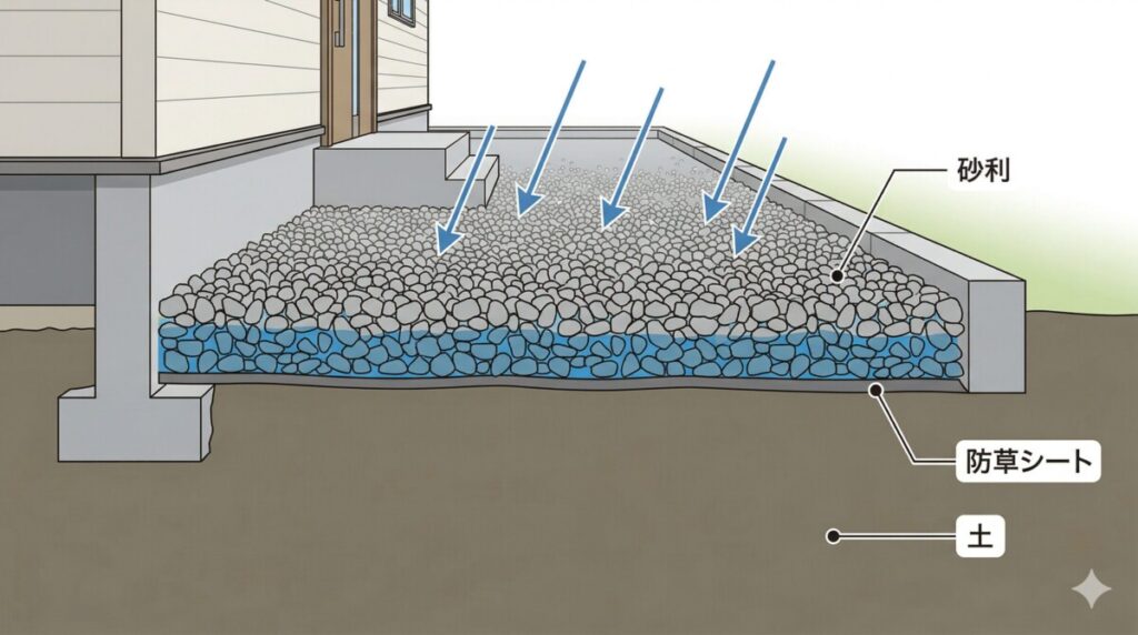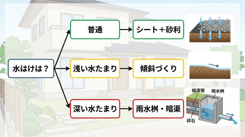 | 普通(数時間で水が引く) | 不織布防草シート+砂利 | 可能 | 泥流入を防ぐ見切り材や定期的な掃除の動線確保 |