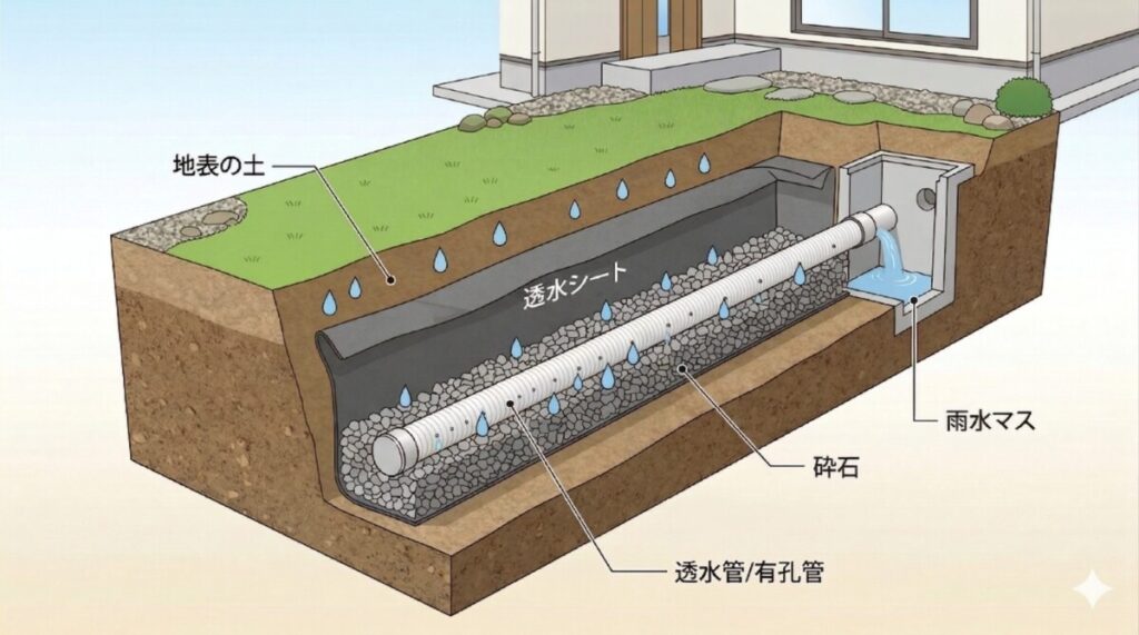暗渠排水とは、地中に穴の空いた透水管(パイプ)を埋め、その周りを砕石と透水シートで包んで、地下で水を集めて雨水マスなどに排水する仕組みです。私の現場でも、勾配が取れない立地や粘土質の庭では、この暗渠を設置することで、長年悩まされていたぬかるみが嘘のように引いていくのを何度も経験しています。