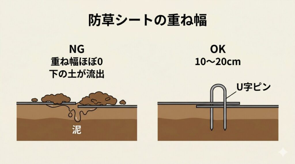 | シートの重ね幅を狭くする(ケチる) | 隙間から土や泥が入り込み、シート下で排水不良や目詰まりが発生 | メーカー推奨の重ね幅(10〜20cm)を確保し接合部を固定する |