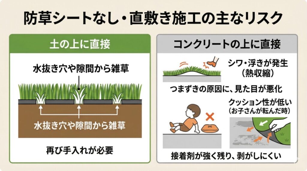 防草シートを使わずに土の上へ直接敷いたり、コンクリートの上へそのまま施工したりすると、あとから後悔につながることがあります。