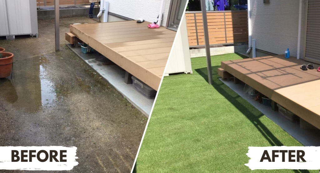 透水性のある人工芝を使用し、下地を適切に整地・施工すれば、水はけはしっかり確保できます。ただし、もともとの地盤条件や勾配によっては、排水対策を追加したほうがよい場合があります。