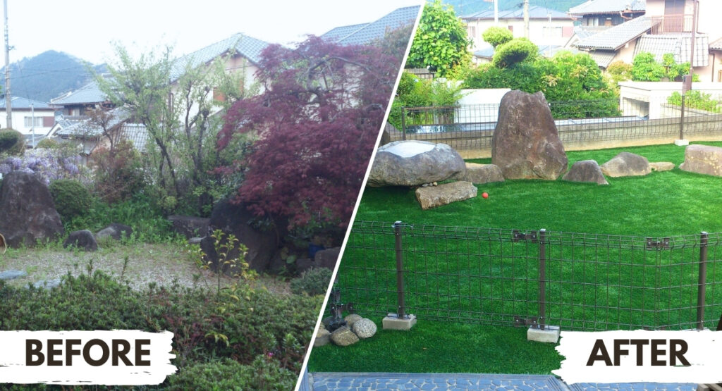 奈良市 庭リフォーム|庭木撤去で庭じまい。人工芝で孫と遊べる庭に