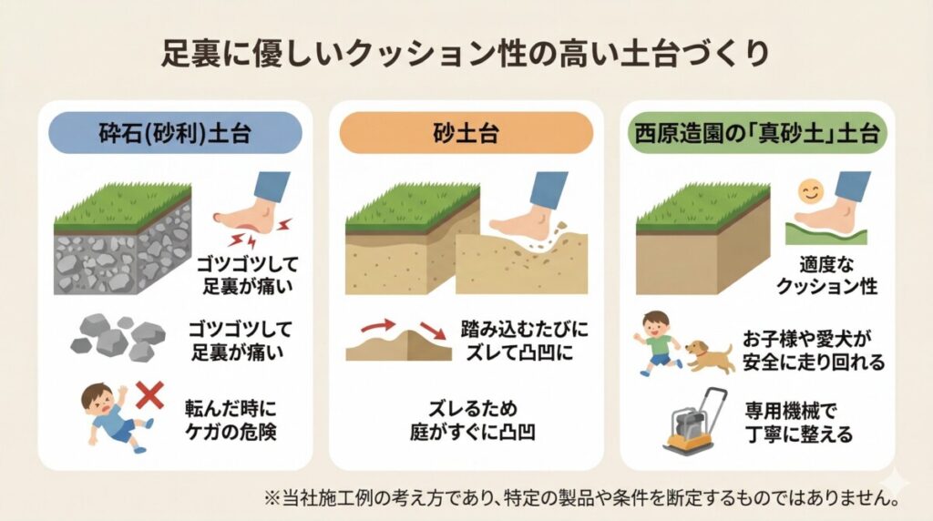 西原造園では、単に人工芝を敷くというだけではなく、数年後に「水たまりができる」「凸凹になる」といった失敗を防ぐため、寿命を大きく左右する「下地づくり」を最も大切にしています。