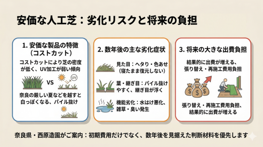 ただ、ここで一つだけ知っておいていただきたいのは、人工芝は「買う時の価格」だけで判断すると、数年後に思わぬ負担につながることがある、という点です。