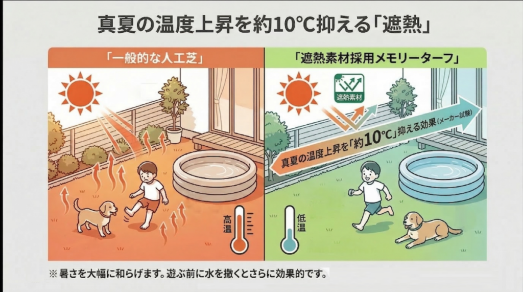 人工芝は樹脂製のため、真夏の直射日光下では表面温度が高くなります。裸足で歩くと熱く感じることがあるため、お子さまやペットが使う前には散水していただくのがおすすめです。あわせて、シェードや日よけを設置すると、より快適にお使いいただけます。