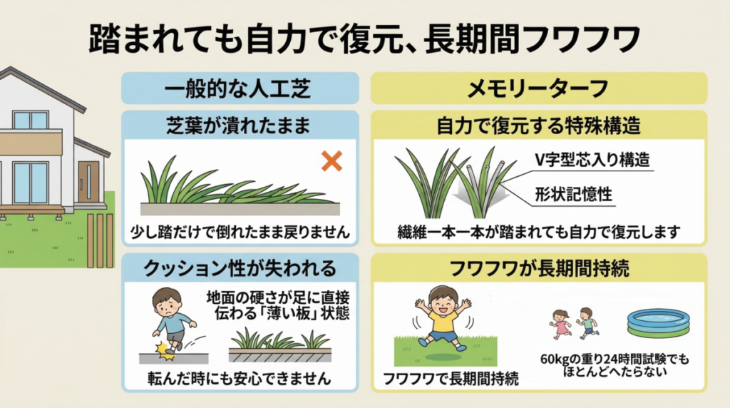 例えば、安価な製品はコストカットのために芝の密度が低く、UV(紫外線)加工が弱い傾向があります。そのため、奈良の厳しい夏を数回越すと、白っぽく色あせたり、踏まれた芝が寝たまま復元しなくなり見た目が貧相になったり、パイル(人工芝の葉)が抜けやすくなります。